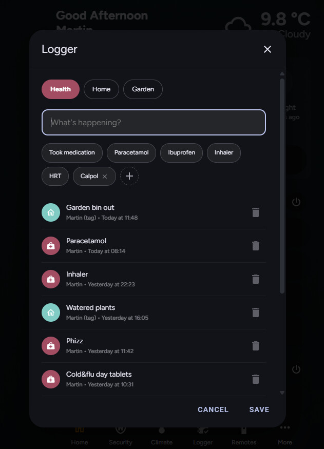 I have also integrated it with my refuse/recycling/garden waste bins too (and plant watering). Again - NFC on each bin. I have systems in place that provides notifications for which bin needs to go out etc. Scanning the NFC on the bin both Logs the Item to my Logger card, and removes the ‘bins out’ persistent notification.