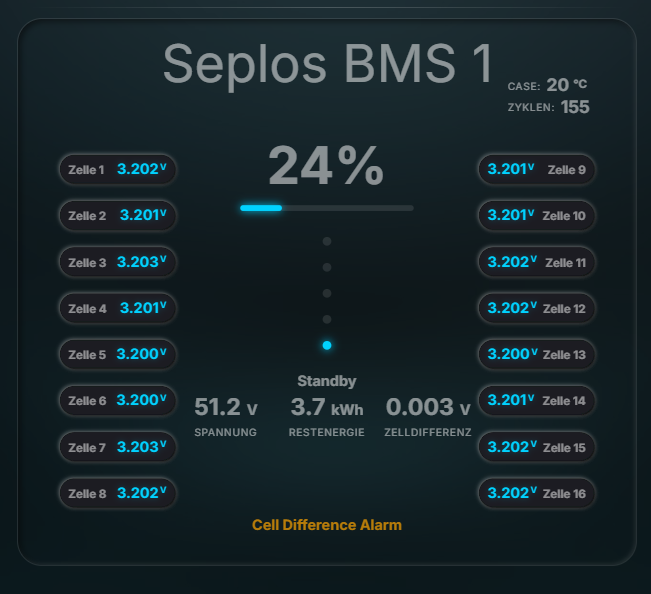 I wanted a clean, modern way to visualize Battery Management System (BMS) data that fits perfectly into “Glassmorphism” styled dashboards. It provides a comprehensive overview of your battery’s health and state at a single glance.