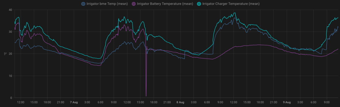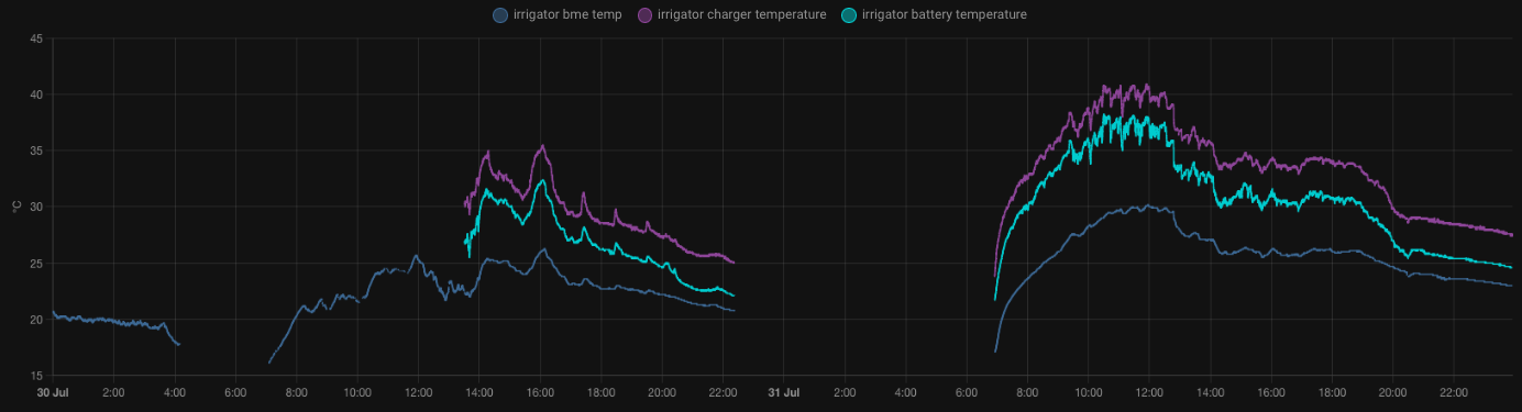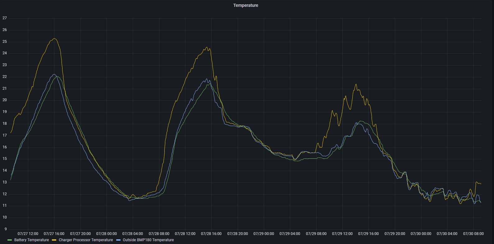 I moved the battery temperature sensor to the casing of the battery a few days ago, so it shows different values than the charger temperature sensor. I already had a temperature sensor in the casing of my circuitry, so there are three values to compare.