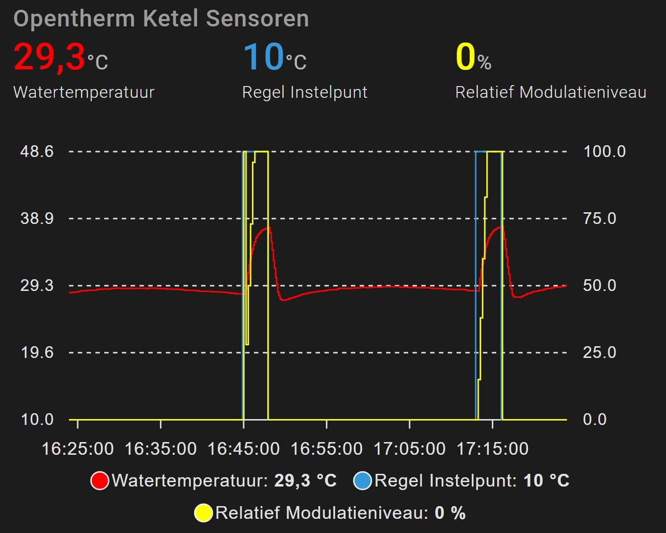 Whats happening: the SAT is controlling the temp by setting the setpoint of water temp to 48 degC. After a few minutes (+/- 4), when the water temp reaches the 40 deg degrees (my max T), its turning the setpoint back to 10 degC. That sequense is repeated until the room temp is reached (see pic). reletive modulation is moost of the time 100% So its working but not yet in the most efficient way I gues.