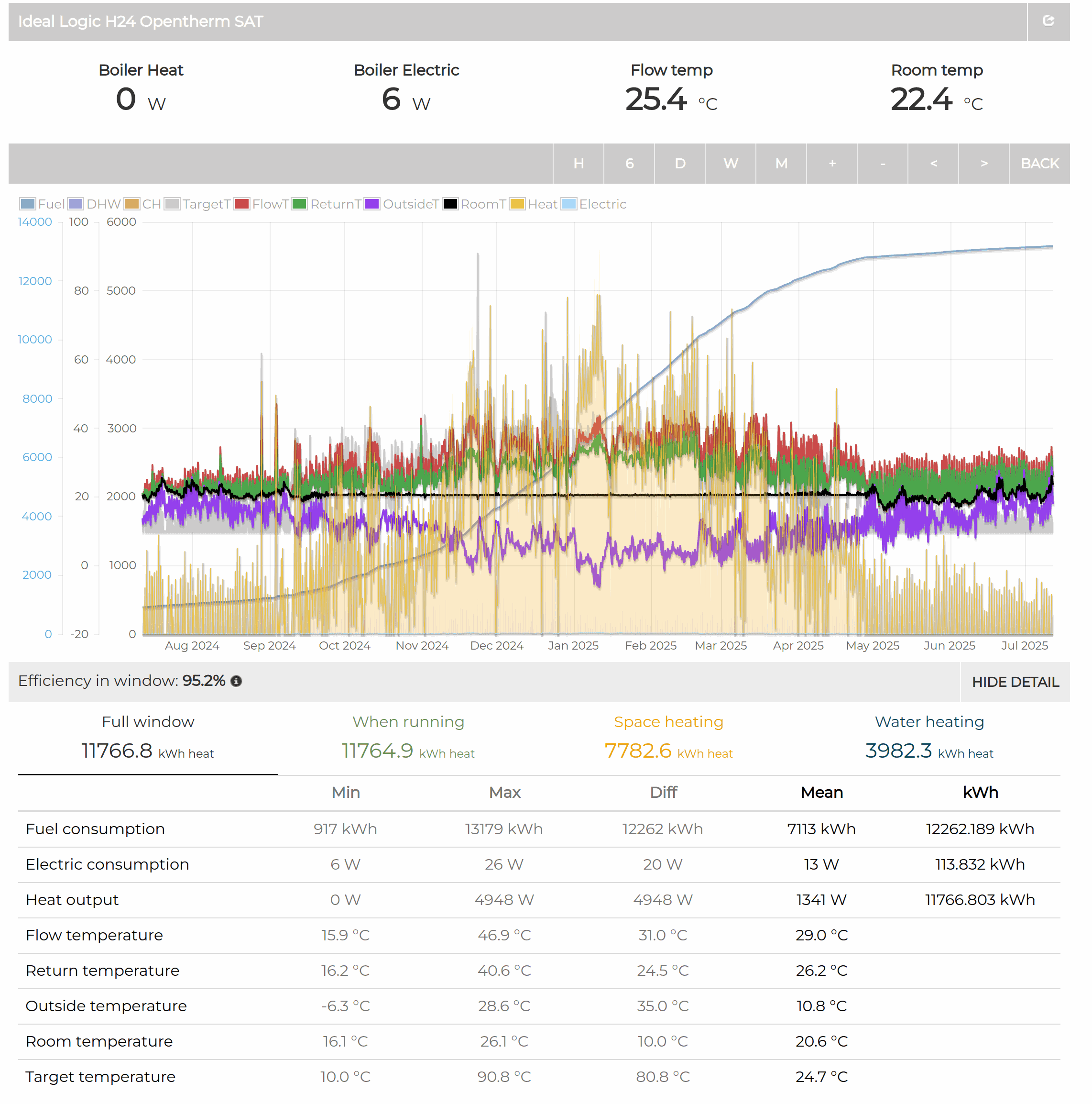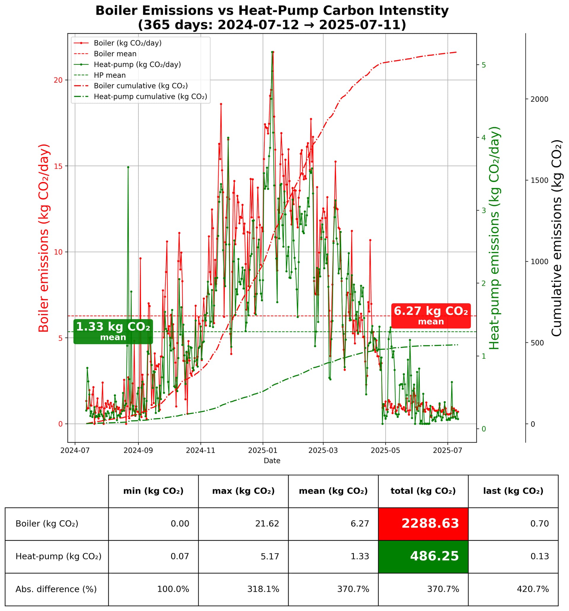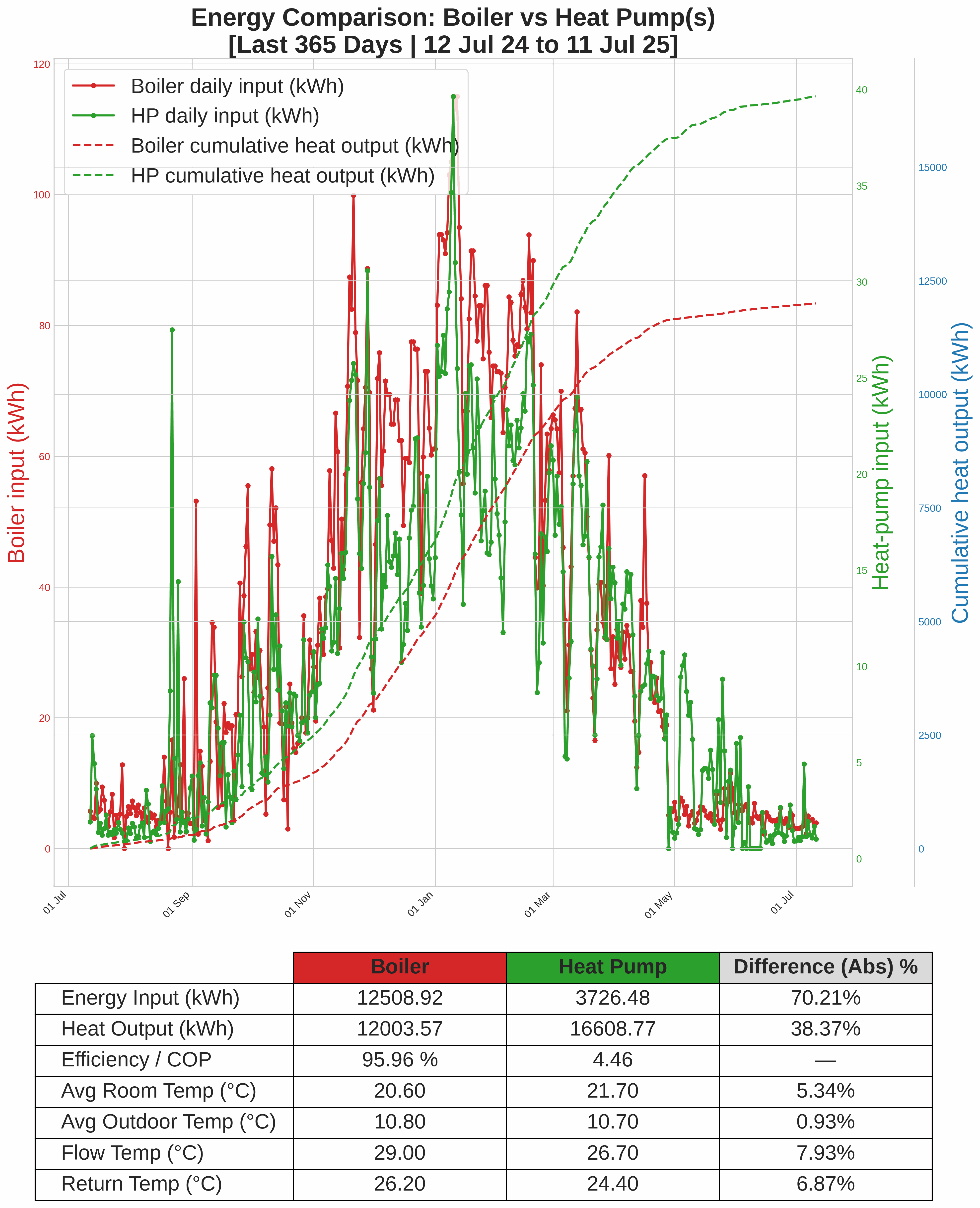 Hi all, a long time SAT user here again. I’d like to share some graphs which compare annual stats between a heat pump and the boiler. Data for the heat pump comes from https://heatpumpmonitor.org/ Both systems are in a similar environment, in terms of house floor area, heat loss and ambient temperatures. Some of these graphs might be difficult to read so please feel free to ask questions.