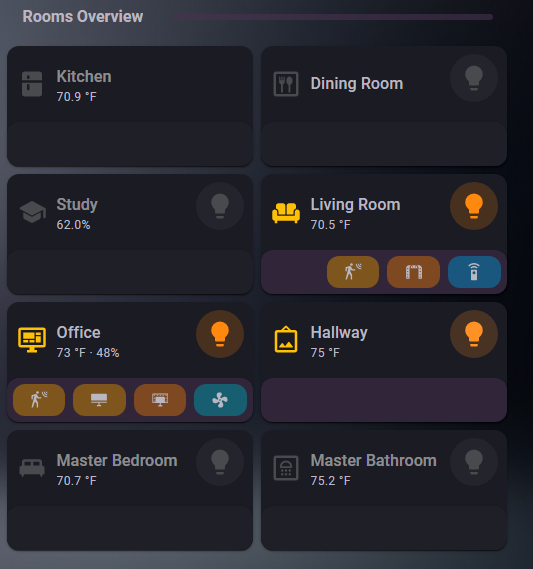 I’m not completely finished with these room cards yet – haven’t set up navigation or popups. There is a ton of logic that I’ve “stolen”, mostly from the card-mod pages – but I’m pretty dense when it comes to css navigation. Theme is Material You (thank you for that!), Background is from Frosted Glass