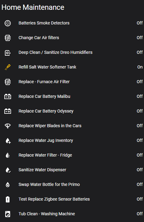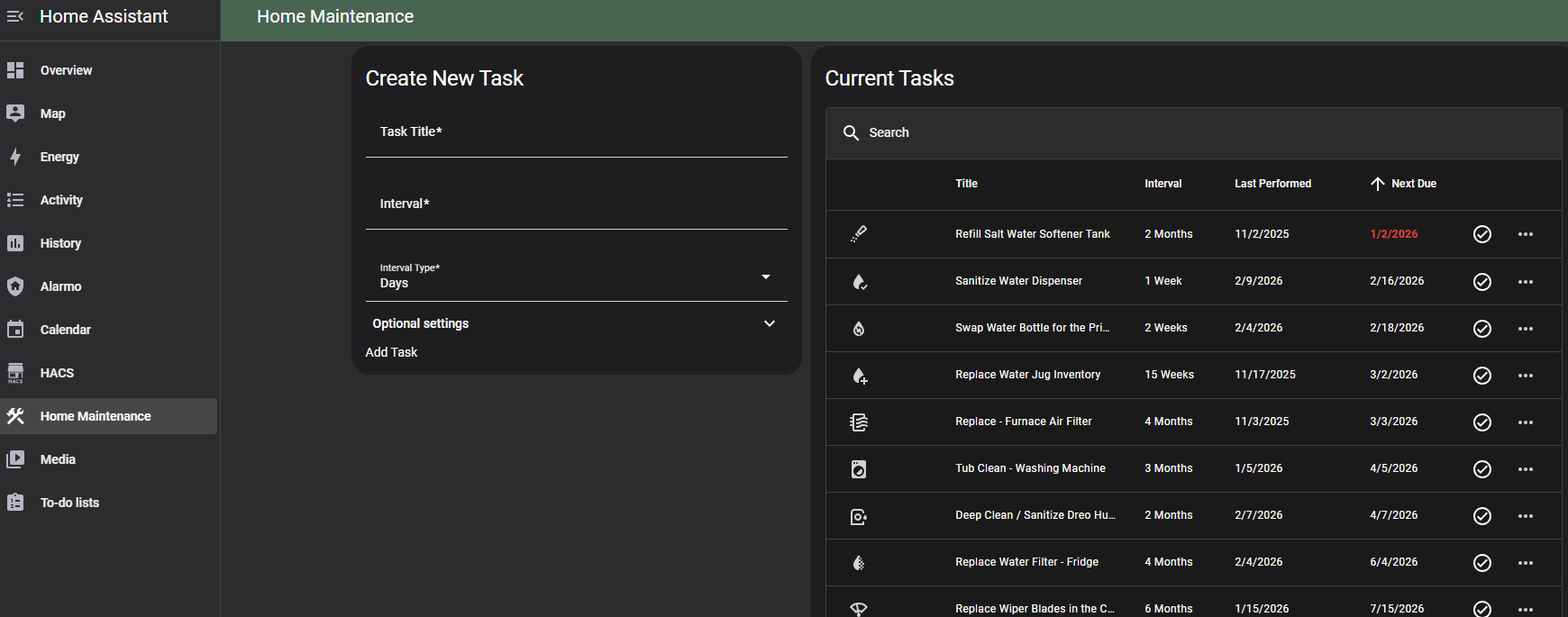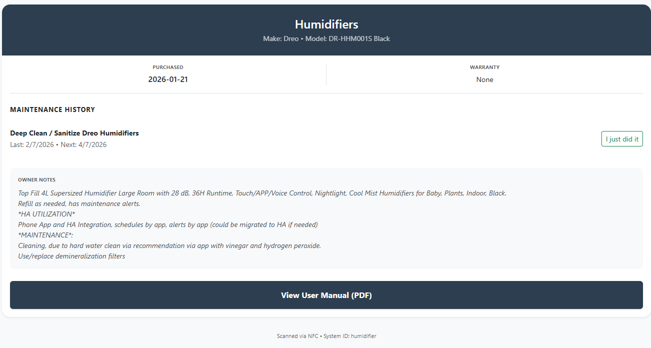 - Link to PDF Manual so I dont have to remember what every button/symbol means. Any specific maintenance task shows when last completed and next due by an -I JUST DID IT- Button which auto updates the record in HomeAssistant.