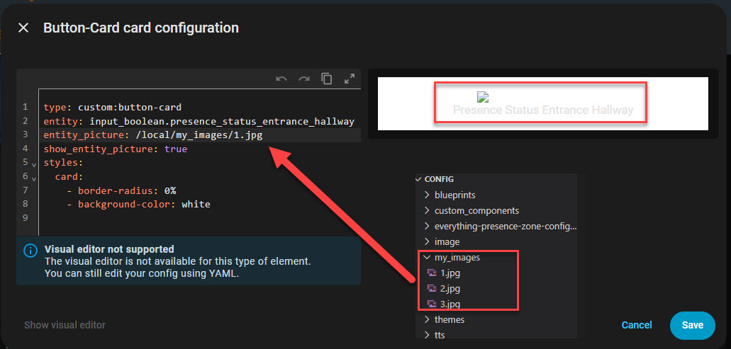I followed here where I had copied all the code, but somehow the image is broken. I have tried uploading 3 different images to test as it could be the image’s problem but I had no luck. I tried clearing the cache from Chrome, restarted HA, I am just not sure what’s wrong?