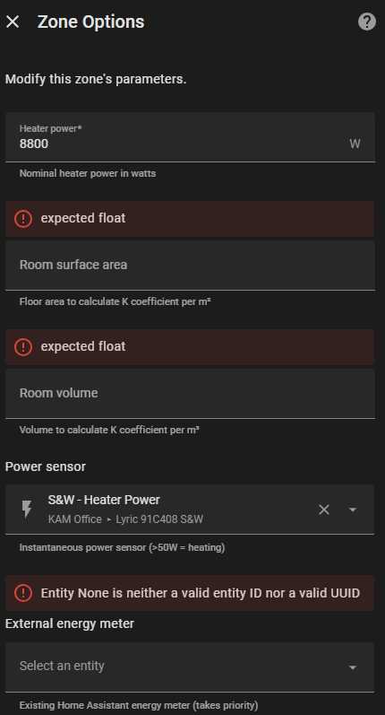 For the energy meter: if you use the same meter for all 9 zones, each zone will display the total consumption of the heat pump (misleading). I’d recommend leaving it empty - the integration will estimate energy based on declared power × heating time, which gives a reasonable per-room approximation.