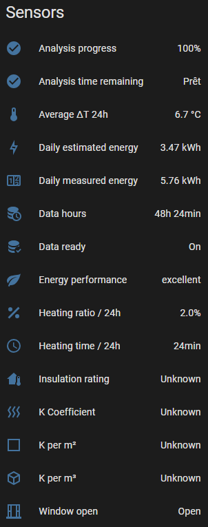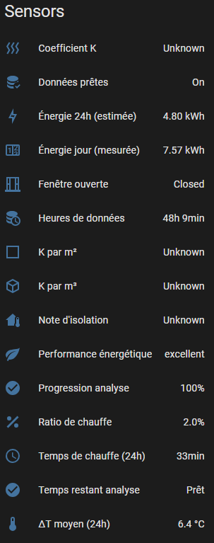 Without individual power sensors per zone, the integration will use estimated energy (declared power × heating time), which works fine for K coefficient calculation. Your global energy sensor can’t be split between zones unfortunately.