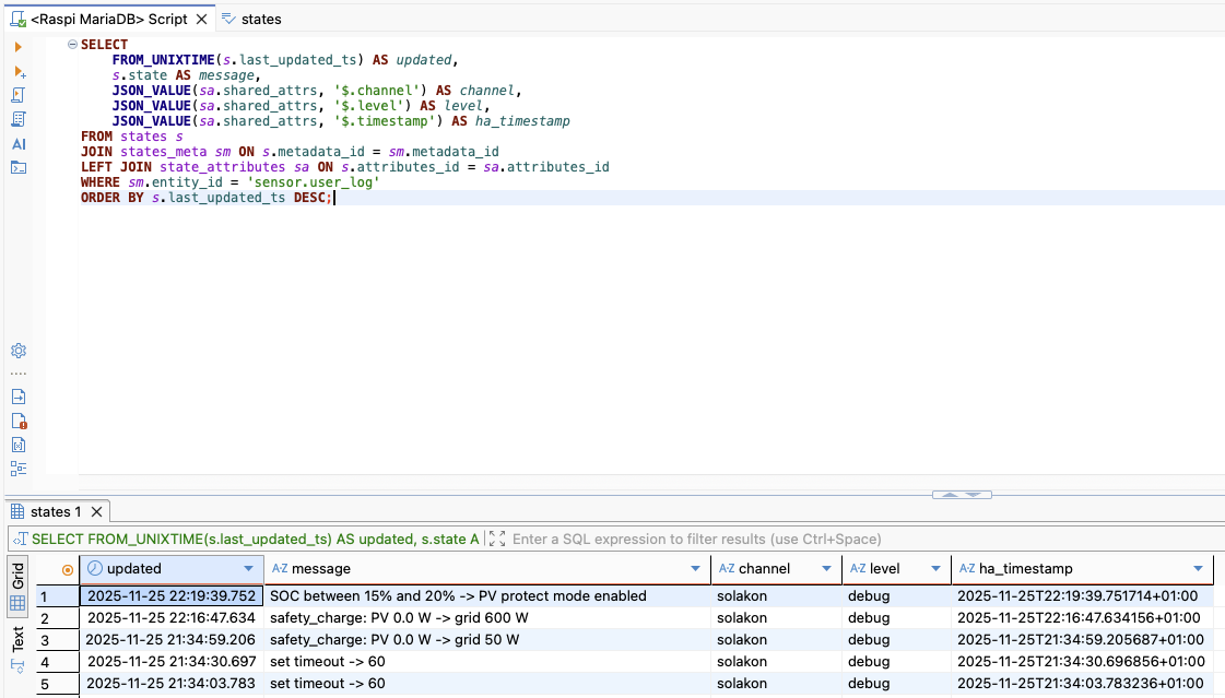 The image shows that the switch to PV protect mode was logged, but the log from lines 237 onwards should also have appeared, as the switch from 600 W to 0 also took place.