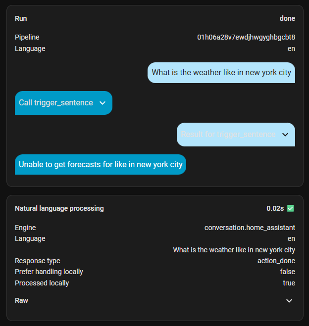 Given that the automation completes successfully, and returns the conversation response, I do not understand why assist returns “Unable to get forecasts for like in new york city” or similar. One hunch I had is that the automation may be taking too long and assist is timing out. From a quick look online, I wasn’t able to find any details to help with that though.