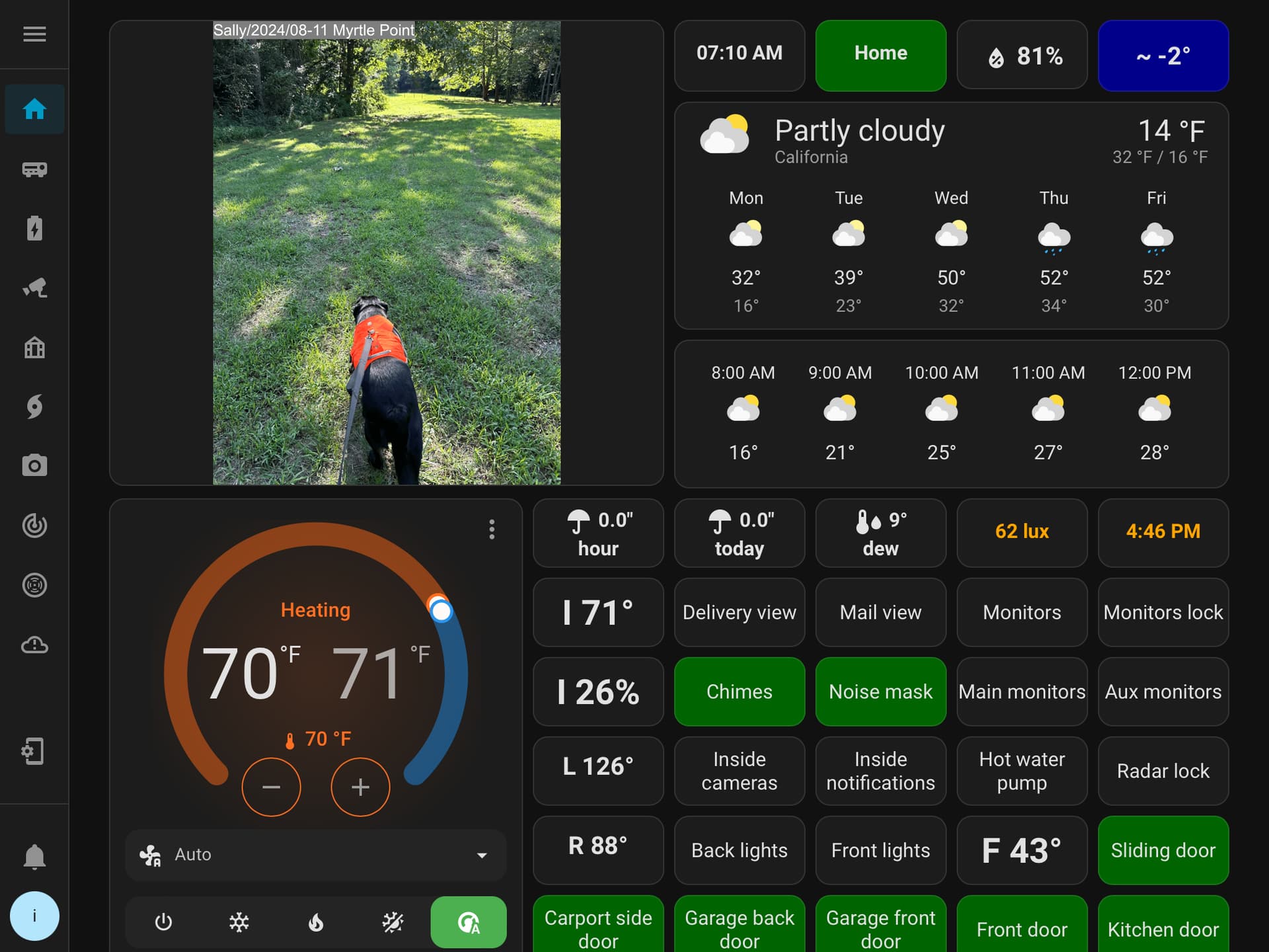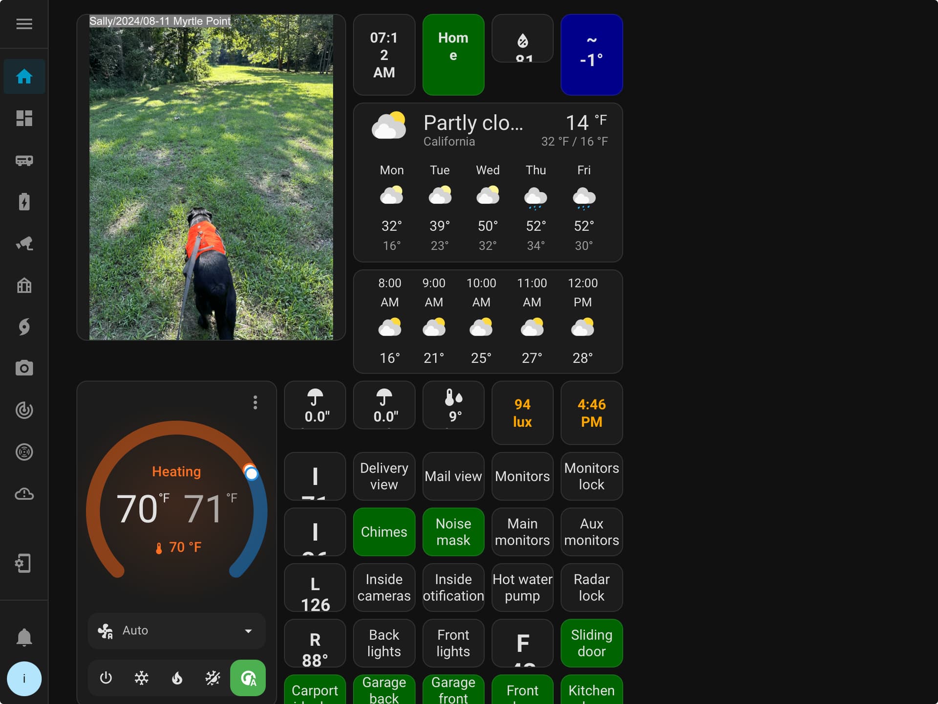 The only extras used are browser-mod for notifications and display on/off, button-card for the push to toggle buttons, card-mod for card colors, and kiosk-mode for hiding the header in non-Admin mode. These have all been in place the whole time.