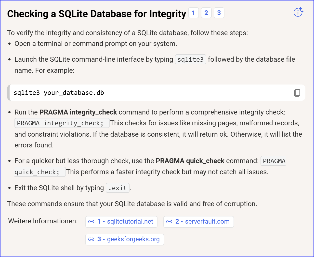 Learning as I go. I just installed SQLite on windows, download the newly created database from MiniPC to Windows PC and ran the PRAGMA quick_check and integrity_check on it. Both return ok, meaning as from now they are not corrupted.