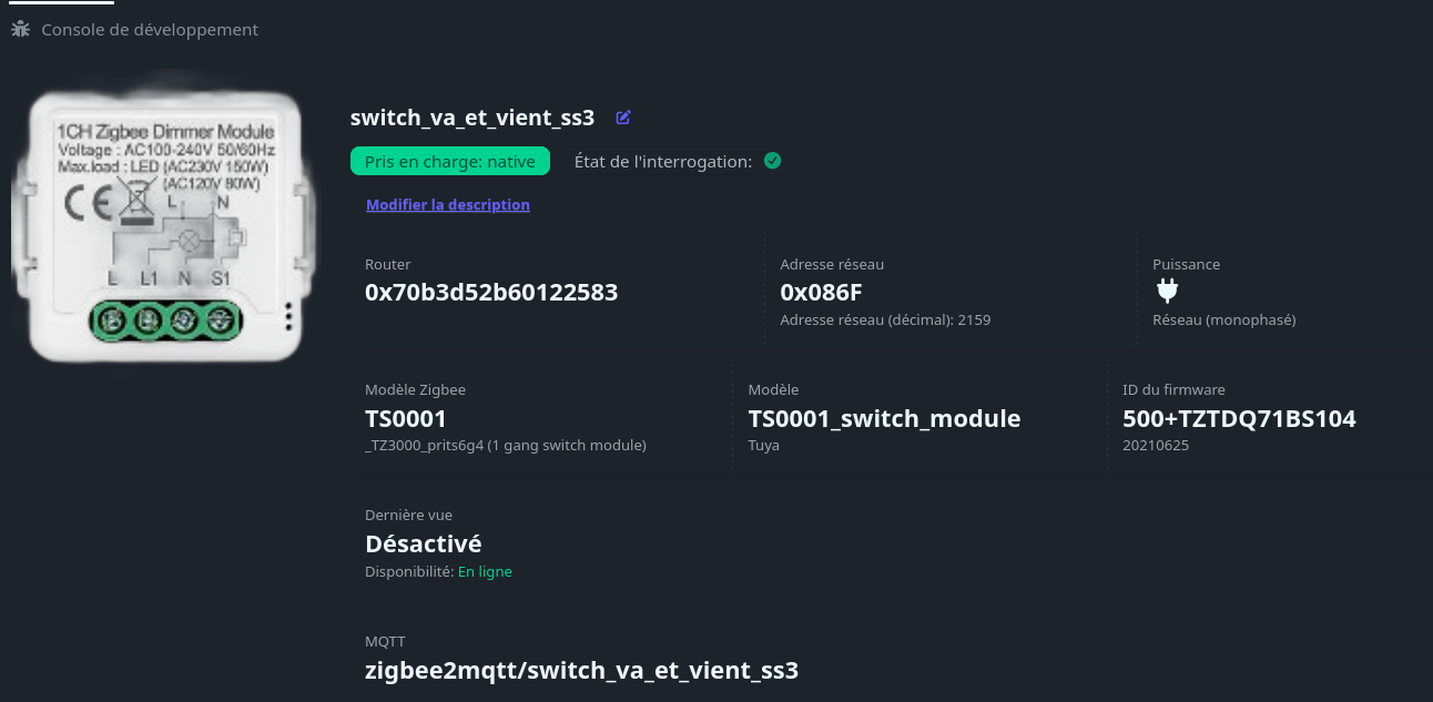 As soon as these modules are paired inside HA using zigbeeMQTT, all is working well, except when I turn on the light, sometime it’s instantaneous, sometime It can take until 30 seconds before switch, sometime just after switch on it toggle switch off and it’s necessary to switch it again.