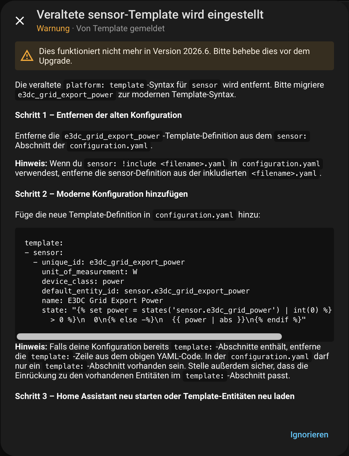 I have 7 repairs mentioned regarding E3DC (my solar power system) sensor templates. I tried editing the templates to the new syntax, but I failed miserably because I just don’t get it.