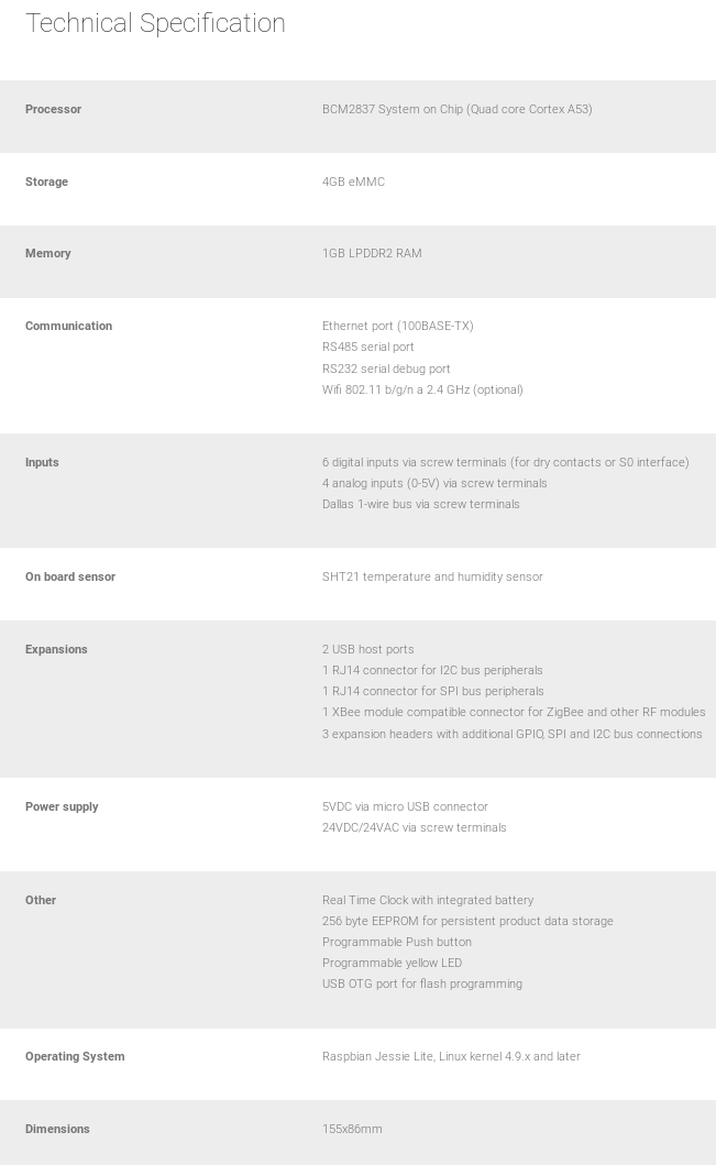 We also started with using the RaspberryPi but soon realized that it required quite some add-ons and modifications to use it properly for an automation project. To start with, we needed some possibility to connect the sensor wires to the RPi. The 40pin header is not exactly a good way of doing this. So we needed proper screw terminals or standard connectors like e.g. RJ14. Also we missed an industry standard communication bus like a serial RS485 port. A real time clock is important for timekeeping during Internet connection outage, so this needs to be added too. Also an on board temperature and humidity sensor would come in handy as well as a programmable push button for user intervention. And why not throw in also analog input channels for connecting analog sensors?