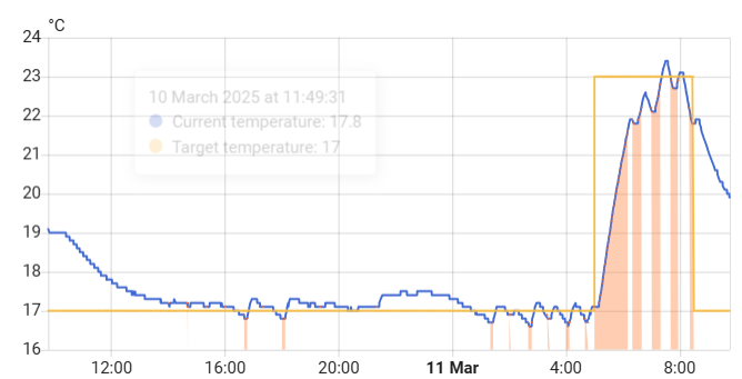 On a different note, is the “Forecast” feature working for you? When enabled, the thermostat should decide when to start warming up the room to reach the target temperature at the specified time. When it is disabled, it starts warming up the room at the specified time. I have it enabled (double-checked in the Devi app), but it always just starts warming up the room at the specified time, as if the feature is disabled.