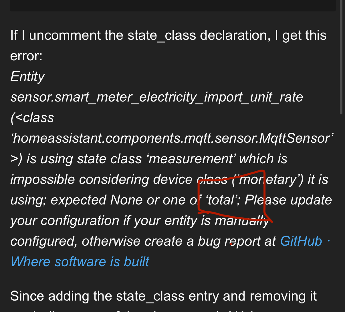 If I uncomment the state_class declaration, I get this error: Entity sensor.smart_meter_electricity_import_unit_rate (<class ‘homeassistant.components.mqtt.sensor.MqttSensor’>) is using state class ‘measurement’ which is impossible considering device class (‘monetary’) it is using; expected None or one of ‘total’; Please update your configuration if your entity is manually configured, otherwise create a bug report at GitHub · Where software is built