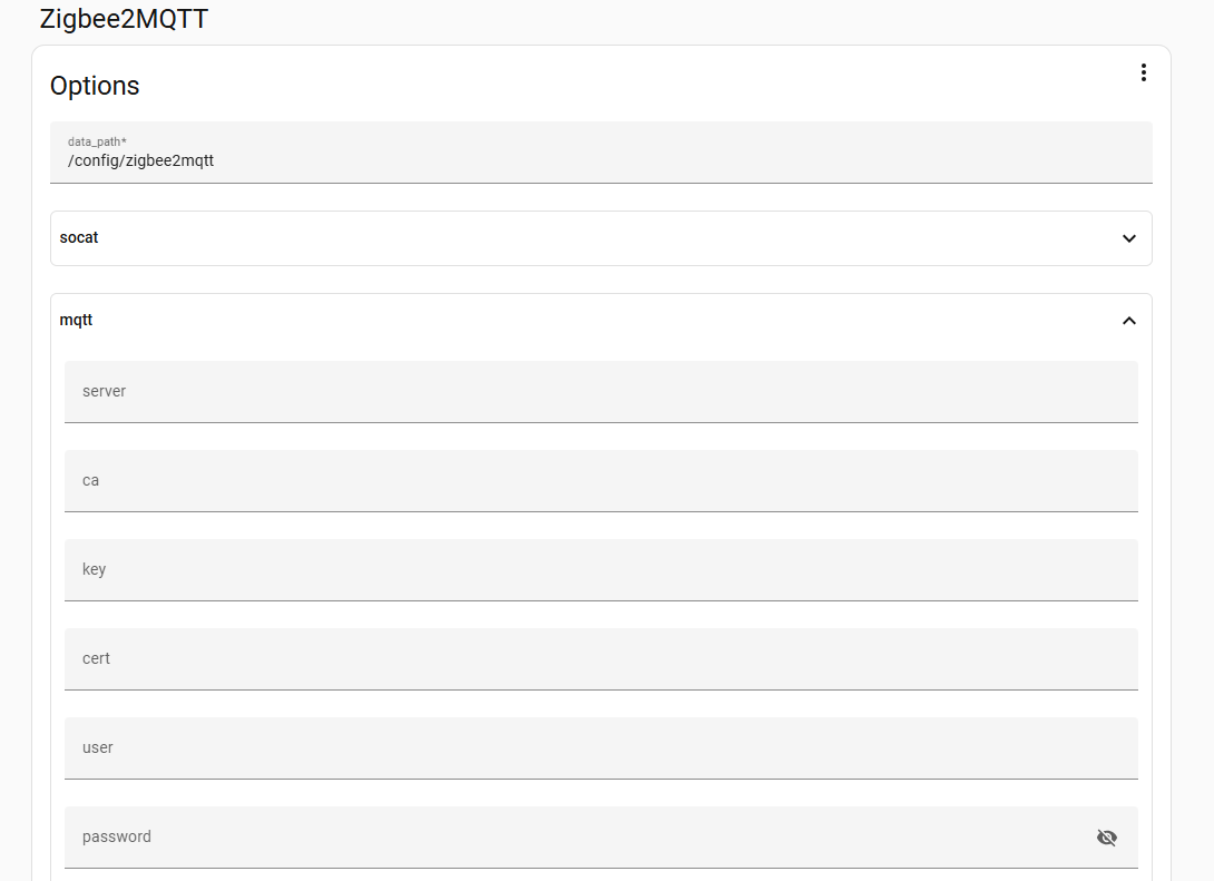 A) In the Zigbee2MQTT add-on UI, expand the “mqtt” section and fill in: