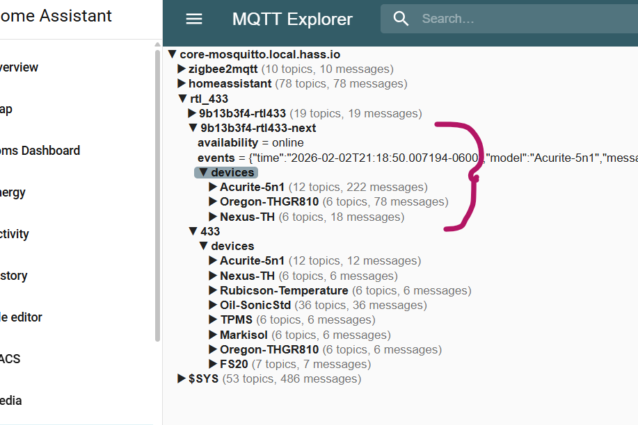 I still can’t see any updates in MQTT Explorer. Maybe my settings are wrong? Also, I don’t get any messages when listening to rtl_433/433/devices/Nexus-TH-1/92/temperature_C, but I have to go back and see if we deleted that.