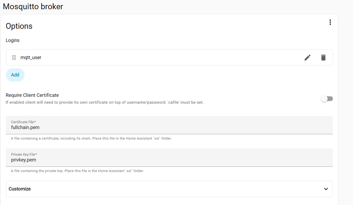 One last thing. I mentioned before that I added a confg file to share/mosquitto. That at least allowed me to start mosquitto. Because of the credentials issue, I took a wild guess and put the following the config file, which I named createdbytom.conf (does the file name matter?). It didn’t change anything.