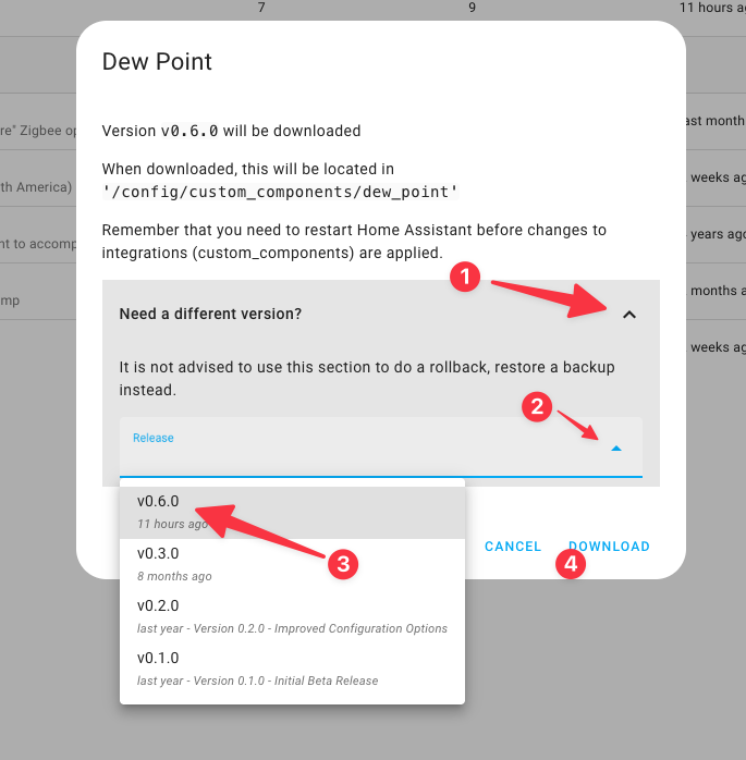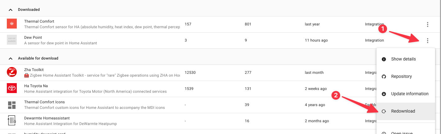 The first option didn’t work. Updated information but still shows V0.4, even after a restart. Then it disappeared after restart, so I added it again to custom repositories. But redownload worked like a charm and as soon as I entered the sensor data, it gave me the dew point as expected and I didn’t have to change anything. If you want to see any of my screens, let me know. BTW, I left output units set to ‘auto’.
