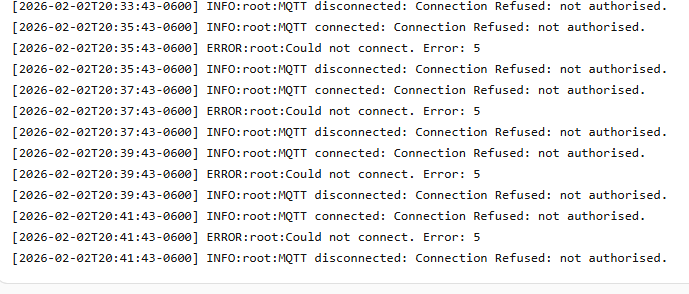 [2026-02-02T08:59:18-0600] INFO:root:MQTT connected: Connection Refused: not authorised.