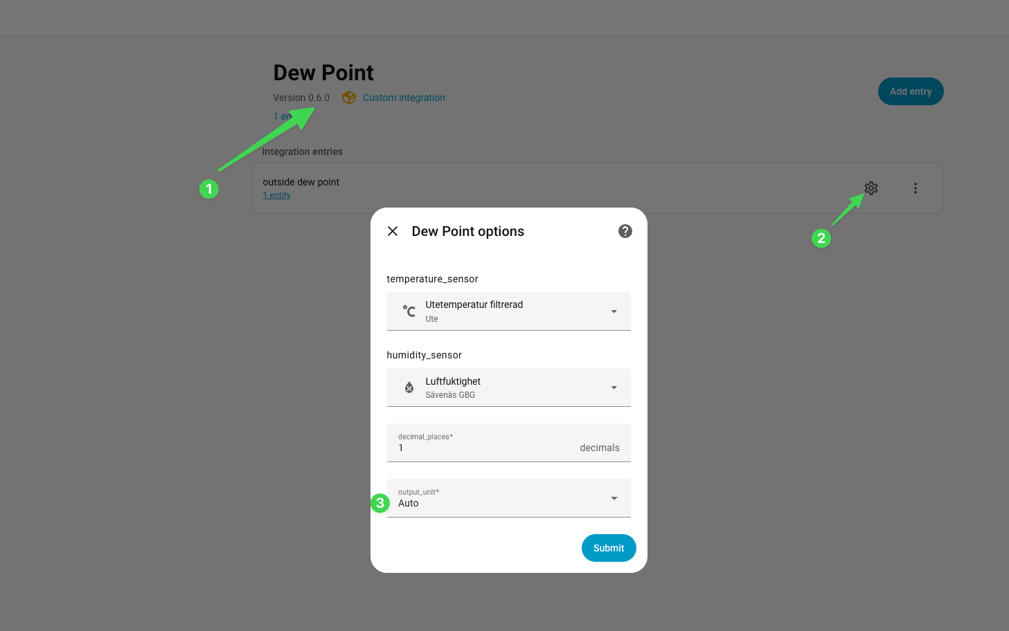 Also, “Auto” output unit only appears in the latest integration version and only inside the config entry settings (gear icon) as in my screenshot. If you don’t see it, please confirm the integration version shown on Settings → Devices & Services → Dew Point.