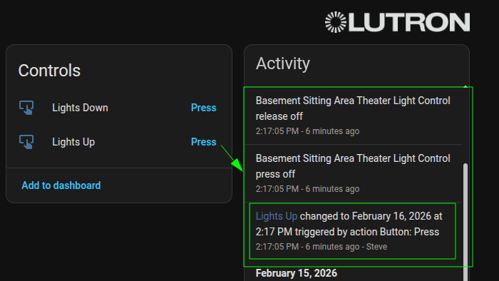 When I use the blue “Press” button on the Controls card of the Device page I see entries in the Activity log like:
