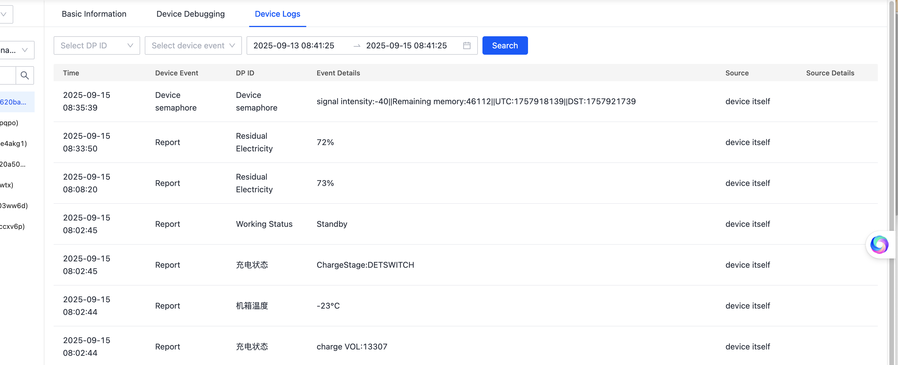 When I click on Debug Device, I can consult the Device Logs but even then the “DP IDs” are not numbers but strings. See: