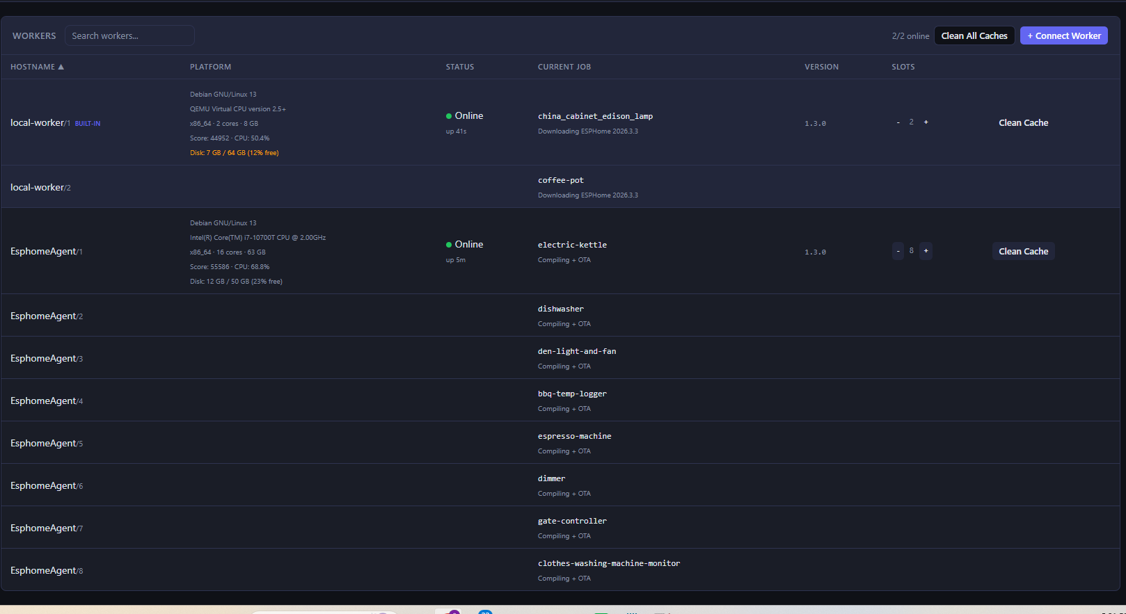 Setup took maybe 15 minutes. Install the HA add-on, spin up a Docker container on your build machine with the server URL and token, done. The web UI shows device status, build queue, logs, and connected workers.