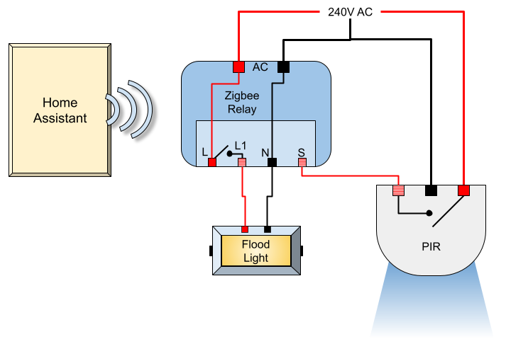I just rewired this very simple circuit slightly, so that switched 240V from the PIR goes into the switch (S) input on the Zigbee relay instead of directly powering the light. This way, when the PIR detects motion, it activates the Zigbee relay using its switch input, and the relay then turns the light on. This means the relay can also be activated remotely, giving us both automatic PIR control, and Home Assistant control.