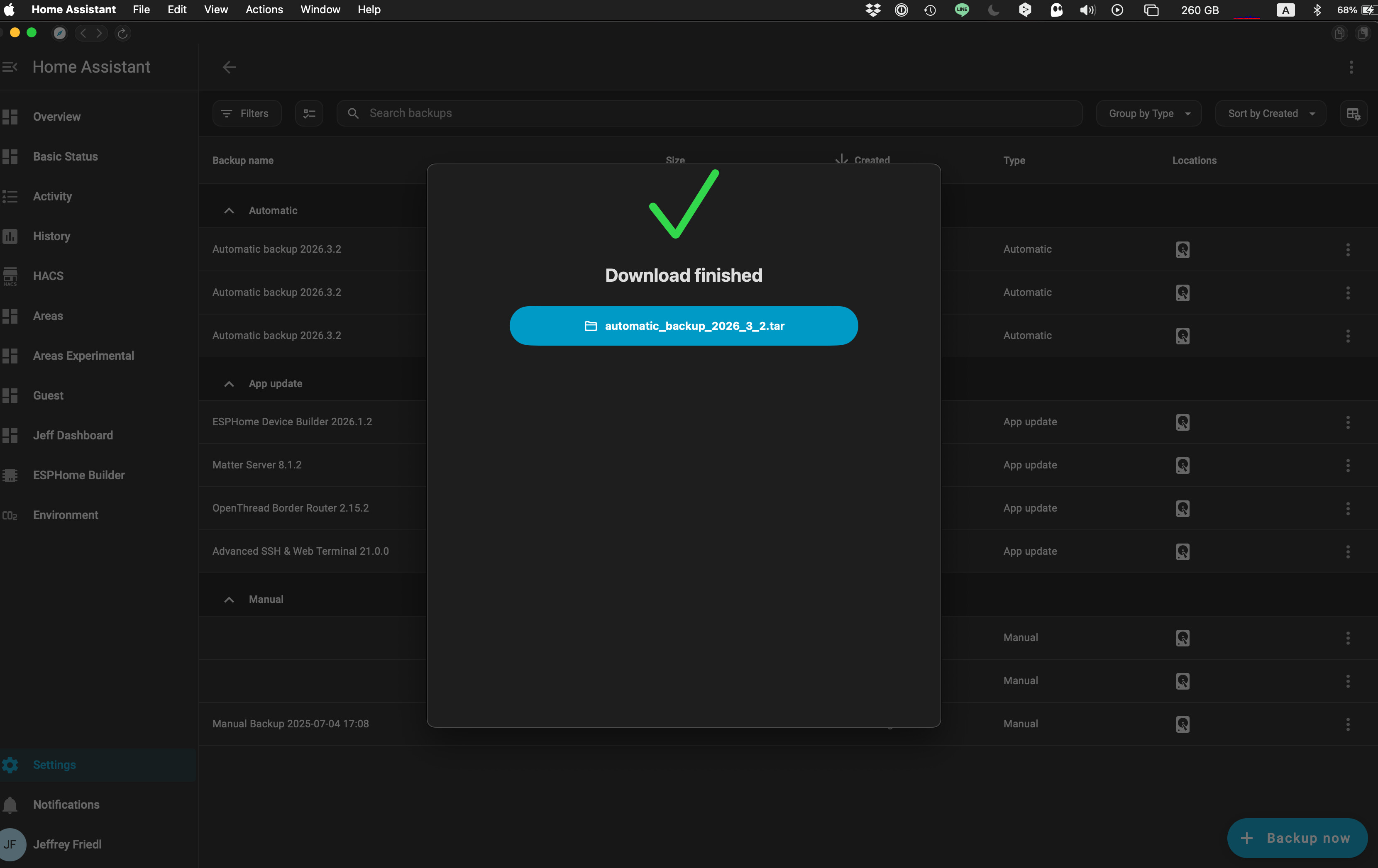 When downloadig a backup HA (app on MacOS) displays an interstichel dialog with the progress, then upon completion a big green checkbox with “Download finished”, but no way to clear the dialog. I have to Force Kill the app and restart.