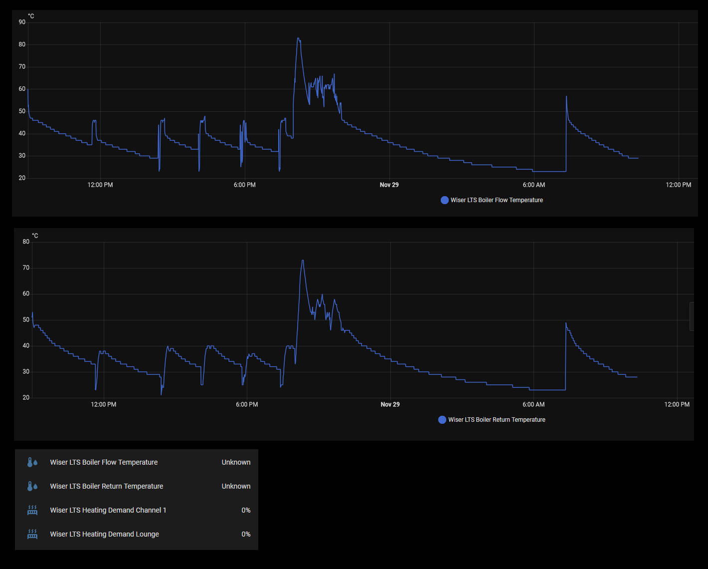 I have recently installed the Drayton Wiser smart thermostat kit to my 2011 Ideal Logic + Combi 30 boiler via the OpenTherm connection and in Home Assistant I was able to view the boiler flow and return temperatures as show in the images below.