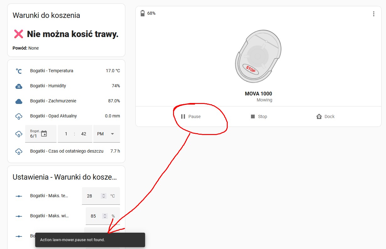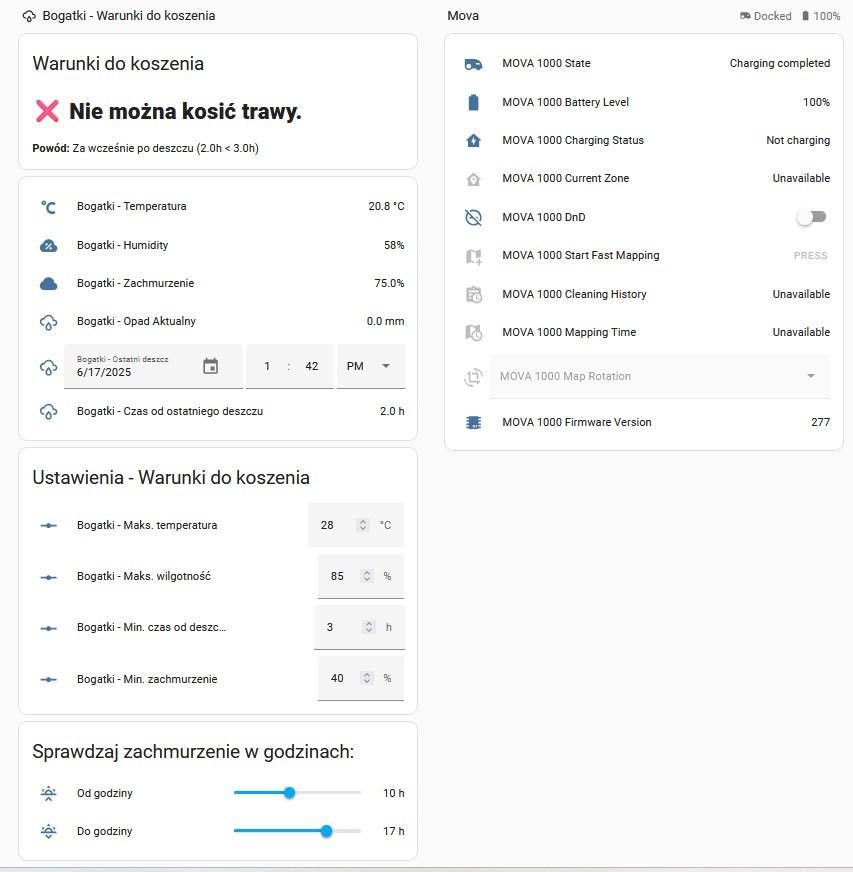 I’ve build conditions that are checking if mowing should happen - humidity (to wet), too early after rain (still wet), temperature to high,not enough clouds (too much sun) — this finally gives a status “Can work (true) / No Mowing (false)” and I’d love to integrate this with the mower now - see attachment.