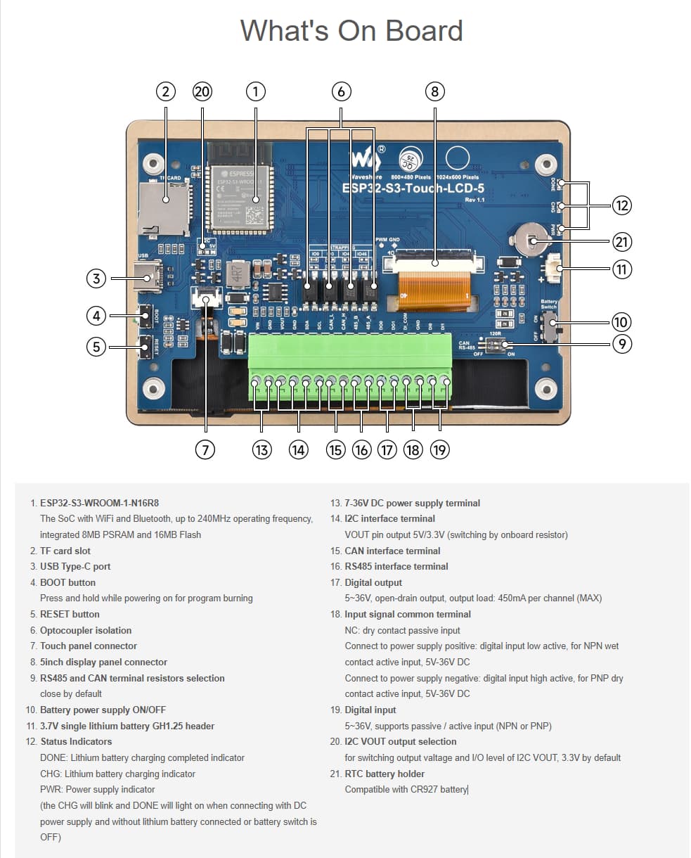I figured I’d jump in here as I’m currently using the ESP32-S3-Touch-LCD 5B to make a smart thermostat with ESPHome. With the help of this thread and other similar ones I’ve gotten the screen connected to ESPHome, the backlight turning on and off and some basic LVGL buttons and widgets functioning. The last thing I need to figure out is the best way to turn on & off the boiler which only requires to close a low voltage (24v) switch. In the past I’ve accomplished this with an ESP32 GPIO and a relay. I’m not against doing it that way again but I’m having issues on finding solid info on what pins to use. I’m having a hard time reading the schematics. Any solid info on what pins to use would be greatly appreciated.