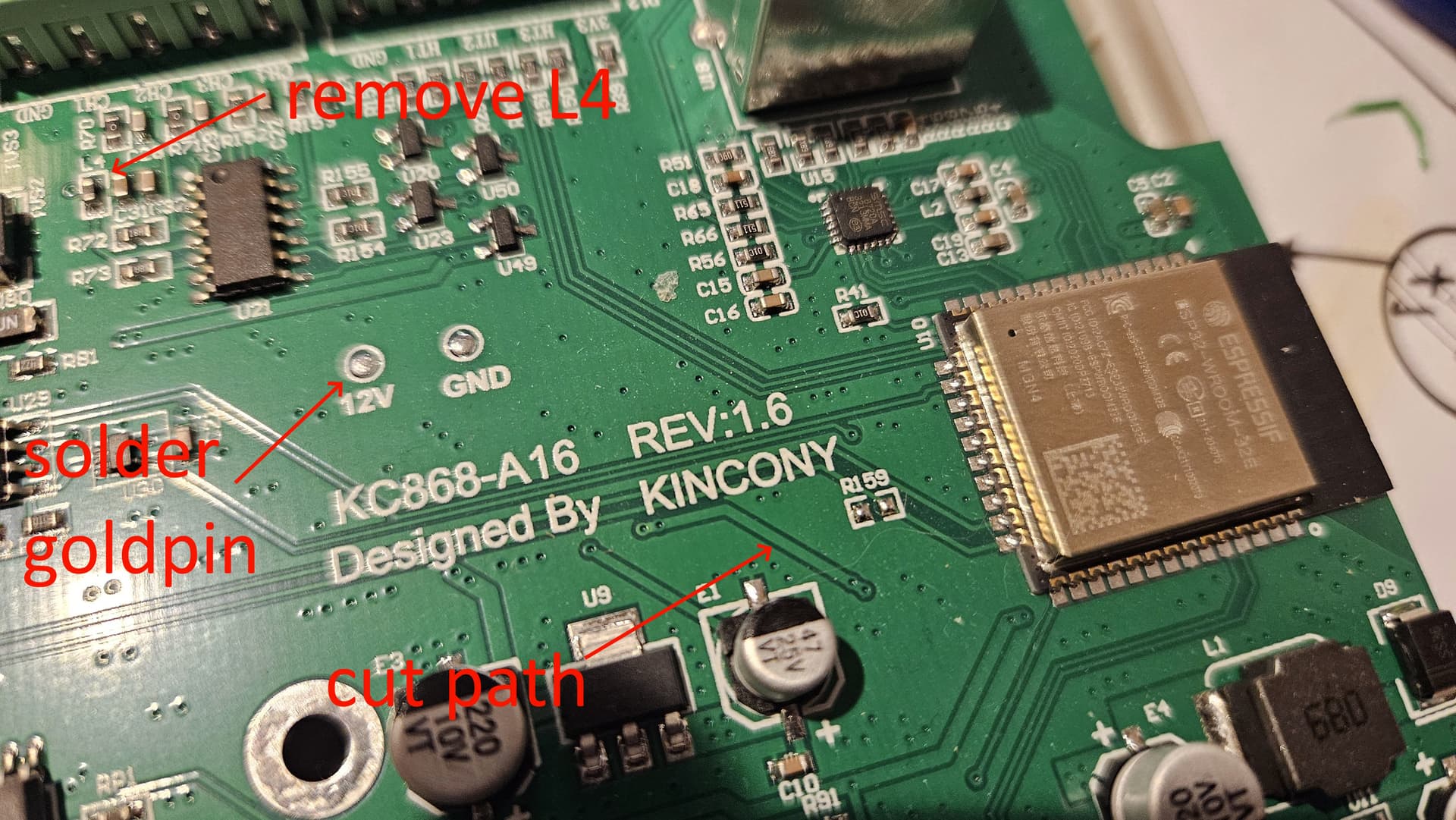 - AUX+ - connect it to newly added goldpin on the KC868 board