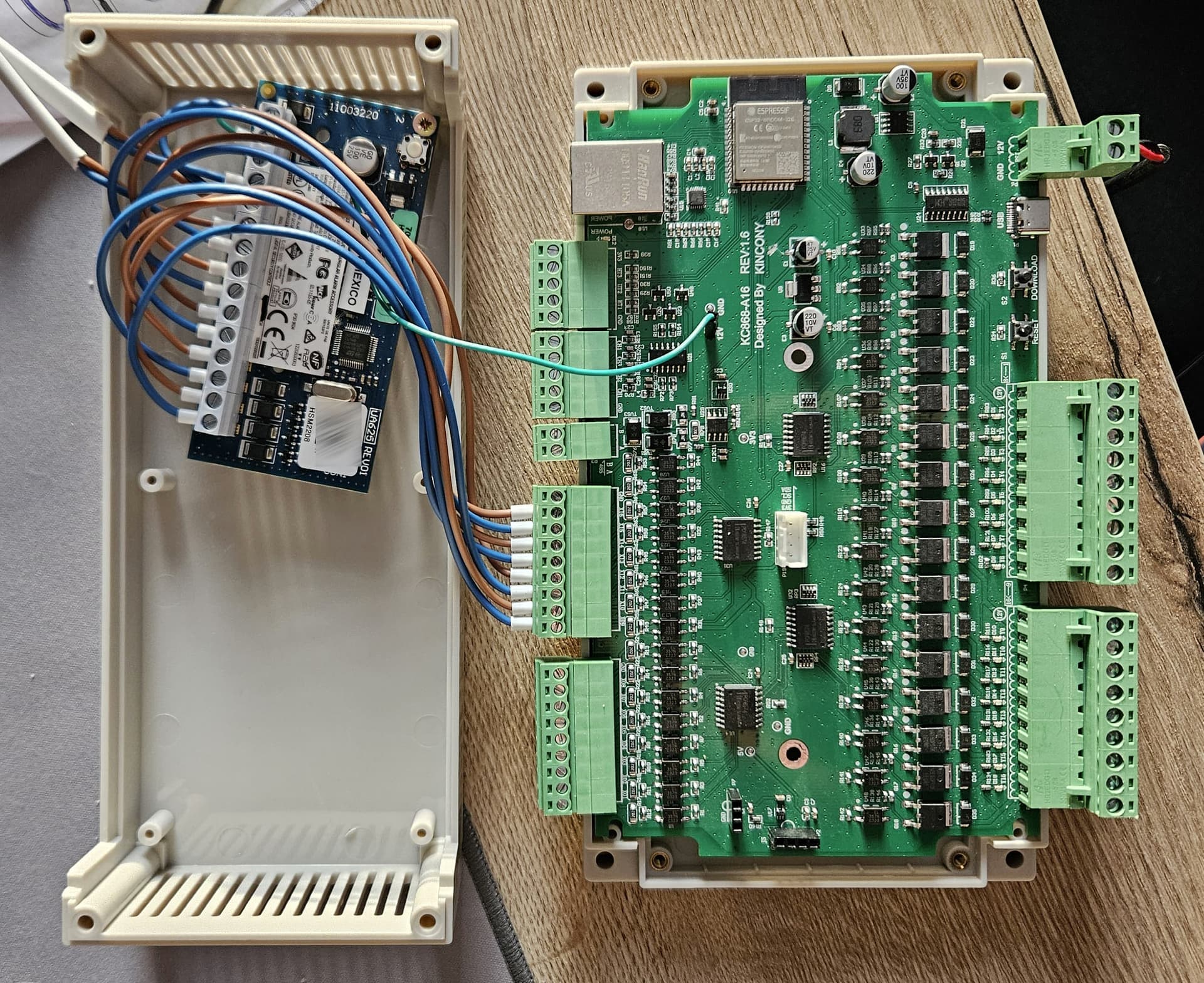 If you order KC868-A16 with dedicated enclosure from Aliexpress you can semi-comfortably fit 1 or 2 HSM2208 modules inside it (see photo above).