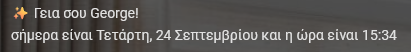 σήμερα είναι {{ day[now().strftime('%A')] }}, {{ now().strftime('%-d') }} {{ month[now().strftime('%B')] }} και η ώρα είναι {{ now().strftime('%H:%M') }}