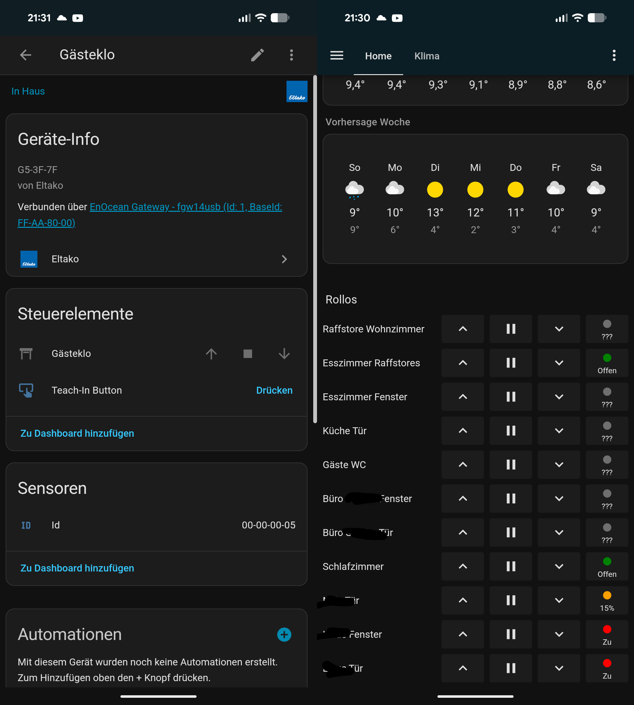 Integration: Eltako ([Dokumentation](https://github.com/grimmpp/home-assistant-eltako), [Probleme](https://github.com/grimmpp/home-assistant-eltako/issues))