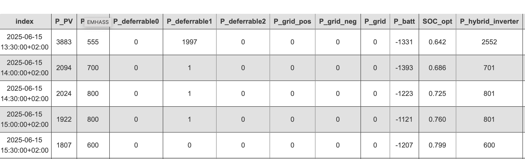 [2025-06-15 13:45:03 +0200] [21] [DEBUG] Optimization configuration: {'costfun': 'self-consumption', 'logging_level': 'INFO', 'set_use_pv': True, 'set_use_adjusted_pv': False, 'adjusted_pv_regression_model': 'LassoRegression', 'adjusted_pv_solar_elevation_threshold': 10, 'set_use_battery': True, 'number_of_deferrable_loads': 4, 'nominal_power_of_deferrable_loads': [2150, 2000, 3000, 3000], 'minimum_power_of_deferrable_loads': [0, 0, 0, 0], 'operating_hours_of_each_deferrable_load': [2, 2, 2, 2], 'treat_deferrable_load_as_semi_cont': [False, False, False, False], 'set_deferrable_load_single_constant': [False, False, False, False], 'set_deferrable_startup_penalty': [3, 5, 5, 0], 'delta_forecast_daily': Timedelta('1 days 00:00:00'), 'load_forecast_method': 'naive', 'load_cost_forecast_method': 'hp_hc_periods', 'load_peak_hours_cost': 0.1907, 'load_offpeak_hours_cost': 0.1419, 'production_price_forecast_method': 'constant', 'photovoltaic_production_sell_price': 0.065, 'set_total_pv_sell': False, 'lp_solver': 'COIN_CMD', 'lp_solver_path': '/usr/bin/cbc', 'lp_solver_timeout': 45, 'num_threads': 0, 'set_nocharge_from_grid': False, 'set_nodischarge_to_grid': False, 'set_battery_dynamic': True, 'battery_dynamic_max': 0.85, 'battery_dynamic_min': -0.5, 'weight_battery_discharge': 0.05, 'weight_battery_charge': 0.01, 'weather_forecast_method': 'open-meteo', 'open_meteo_cache_max_age': 30, 'start_timesteps_of_each_deferrable_load': [0, 0, 0, 0], 'end_timesteps_of_each_deferrable_load': [0, 0, 0, 0], 'load_peak_hour_periods': {'period_hp_1': [{'start': '08:00'}, {'end': '17:00'}], 'period_hp_2': [{'start': '08:00'}, {'end': '17:00'}]}}