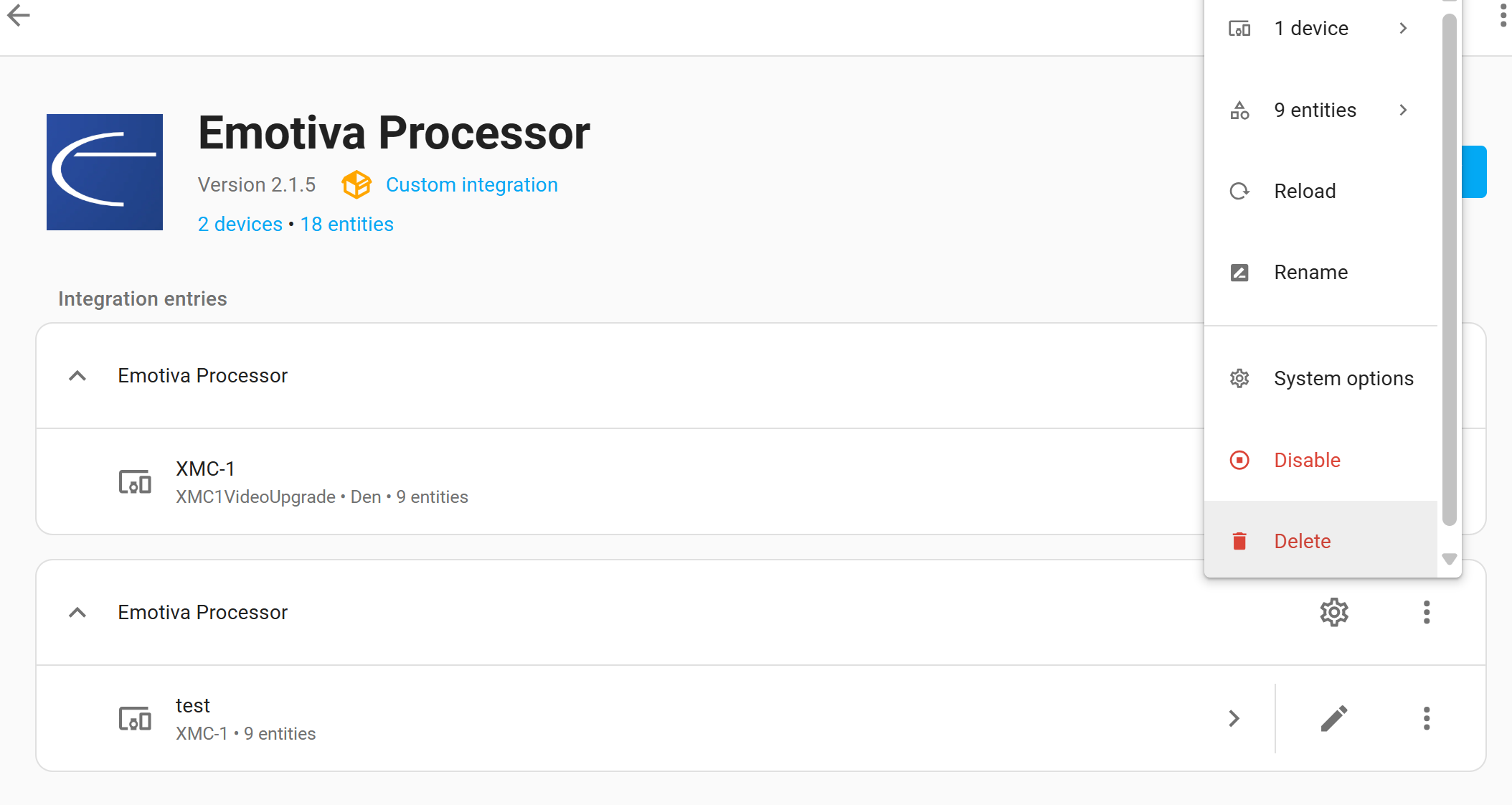 Ah - that makes sense. It’s auto discovered the devices so they’re showing up under the same configuration entry - the entry basically says to discover all the devices it can and add them. You’re not really deleting the integration by hitting delete next to Emotiva Processor, but you’re deleting the config entry which says “discover”. So, to get rid of the existing devices, you’ll have to delete the config entry I’m afraid. I should probably move the discovery to the config flow, and then it would create separate config entries, but it’s not been a problem before
