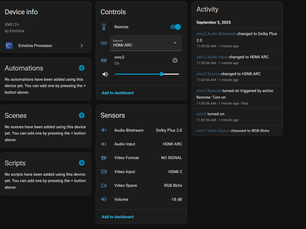 When I turn on my XMC-2+ using the physical remote in Home Assistant (HA), the power state accurately reflects the current status, i.e., it shows as “on” in HA. I am also using a Sony OLED XR-77A80J TV with CEC control to turn my XMC-2+ on and off. This might be the issue, as HA does not seem to detect or capture the state change when I turn the TV on or off. The state in HA remains unchanged.