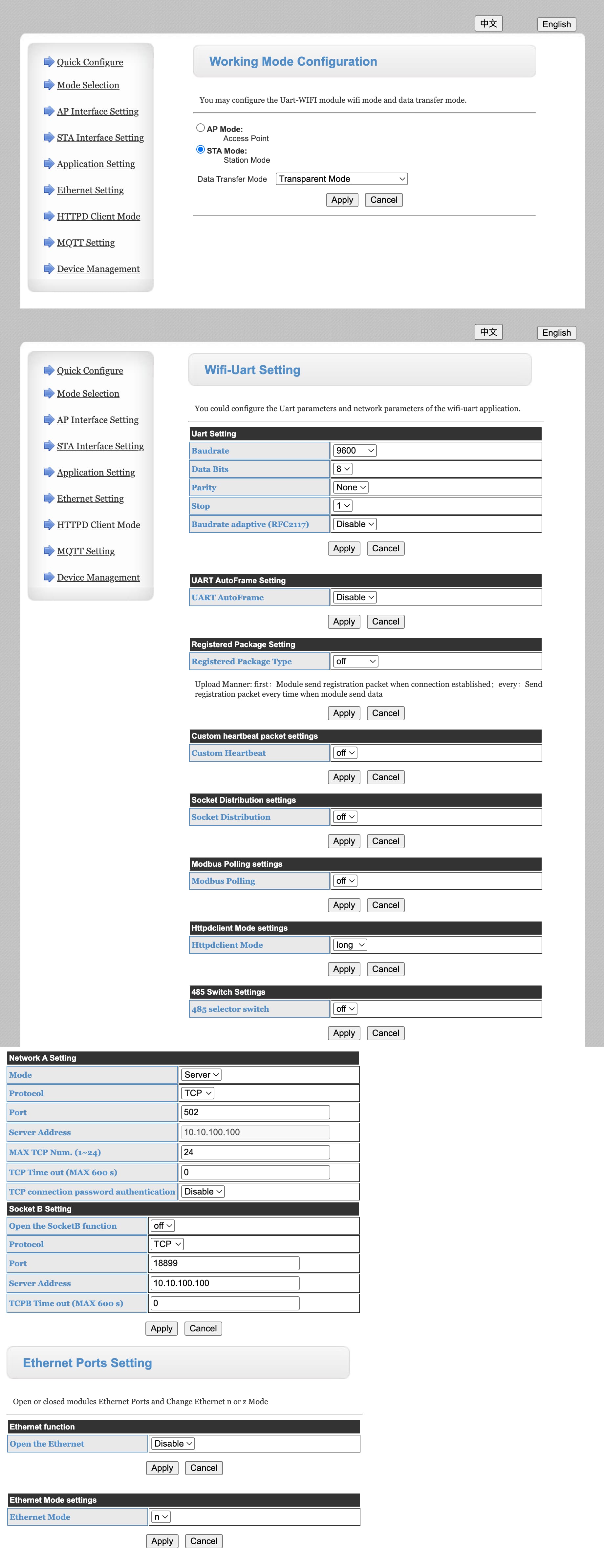 I have reset my RS485-to-ETH to factory defaults and changed the IP adress to DHCP (static 192.168.200.78), port 502, work mode ‘TCP Server’ (default), 9600 baud.