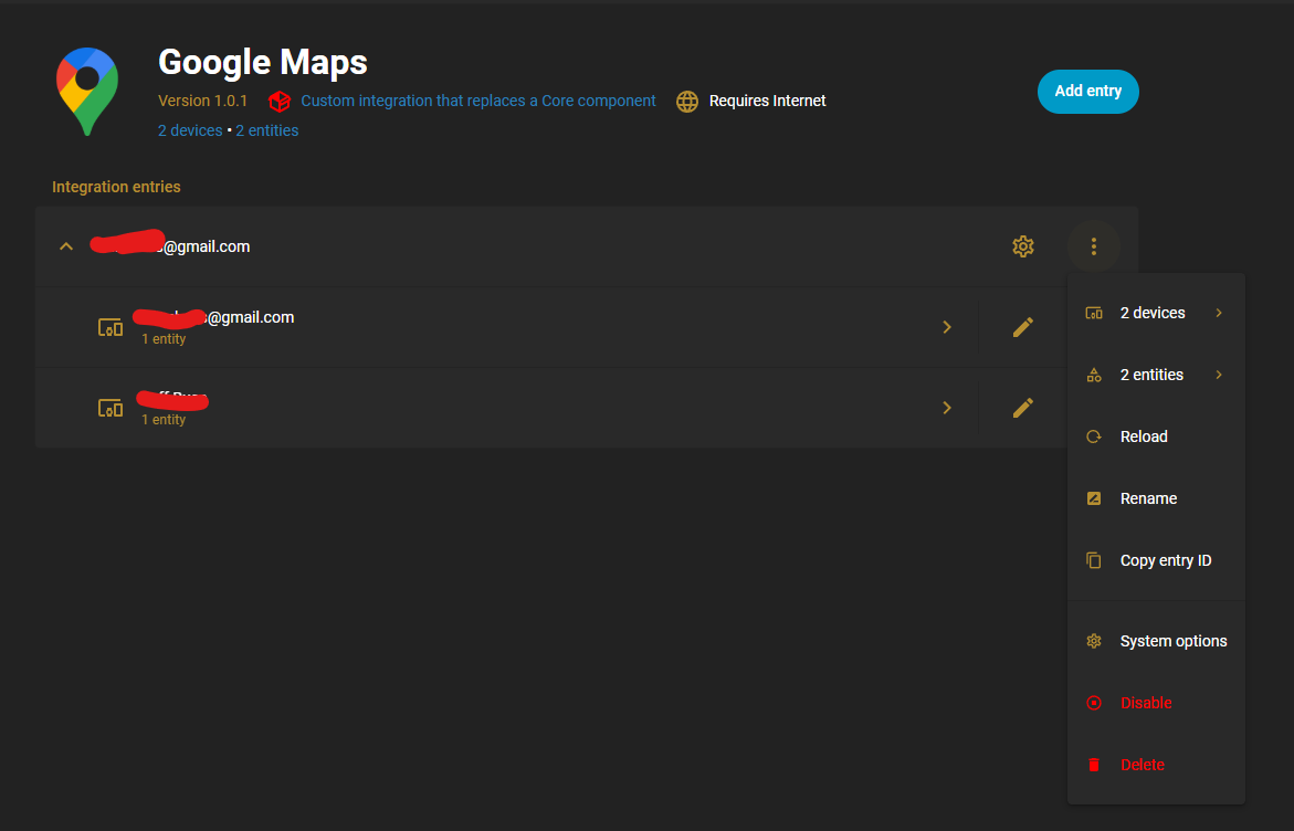 now I need to remove the first sub entry (the one with @gmail.com following it). But I don’t see a delete option for the sub entry, just the integration entry. All I can do is disable the device/entity for the first sub entry. but if I just disable it the device/entity is still there but just greyed out.