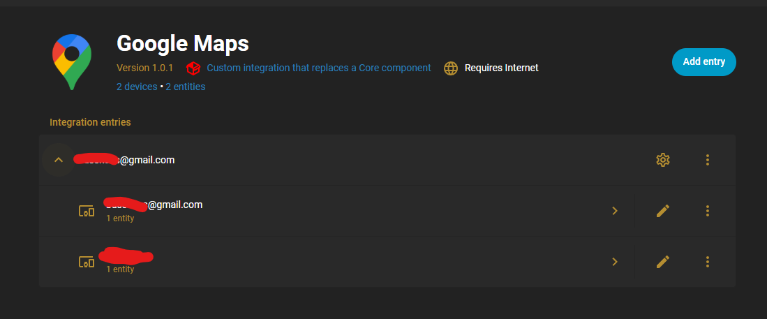 When you go to Settings → Devices & services → Google Maps, how many “Integration entries” do you see? There should be one for each Google account you’ve entered, and each one’s name should be (at least by default) the email address for the account.