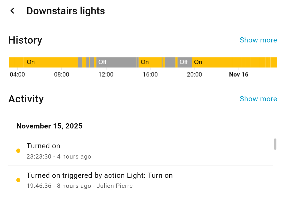 Node 296 is a ZEN76 800LR switch, which is used to control a traditional load - bathroom fan and regular (not smart) light on the same circuit. There is a corresponding “Light” device in HA for this switch. And it is part of the “Downstairs lights” light group that I turned on using the HA app.