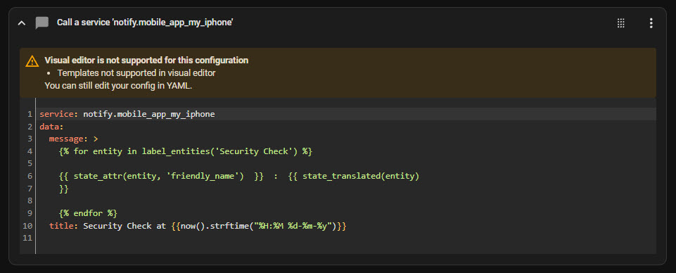 I’ve done single notifications where various triggers set it off, but I want to make a list of entities and just have the notification report the status on each. My ultimate goal is to have a security report once a night saying x door is open, y door is closed, x lock is unlocked, y lock is locked; that way I know I have to secure various items afterwards.