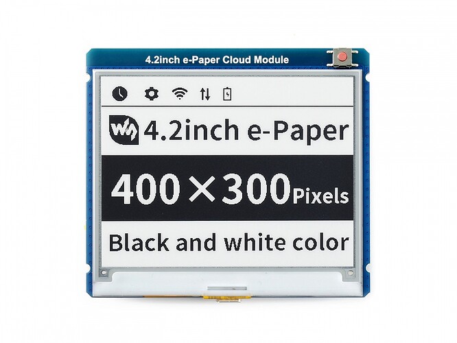 I got an ePaper from Waveshare, 4.2 inch, called Cloud Module as it is delivered with an embedded ESP32 module (Expressif WROOM-32), providing BT and WLAN connectivity. It is sold under the SKU 18525.