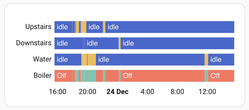 You can track how long the boiler is actually running (different to how long a zone is on) if the boiler state is reported correctly. This is visible in the climate card where it should indicate Idle or Heating. If the thing is set to on and state is reported as Heating the boiler is on.