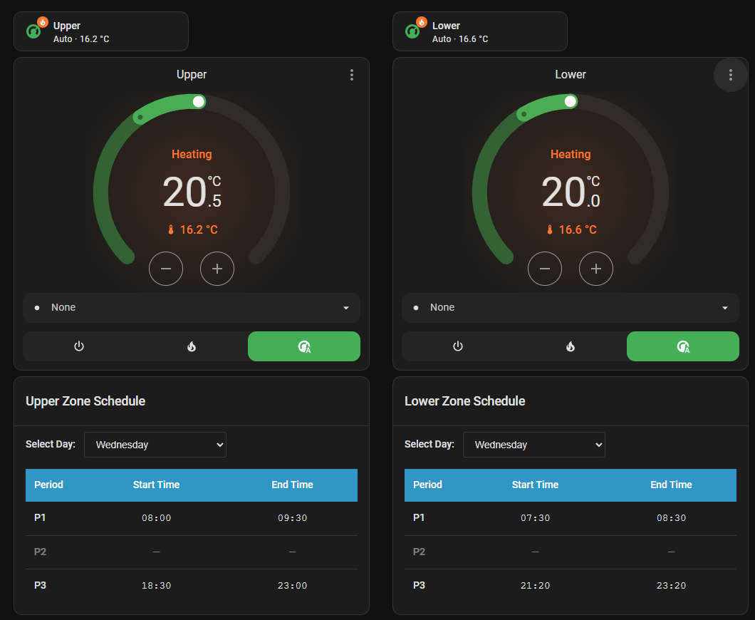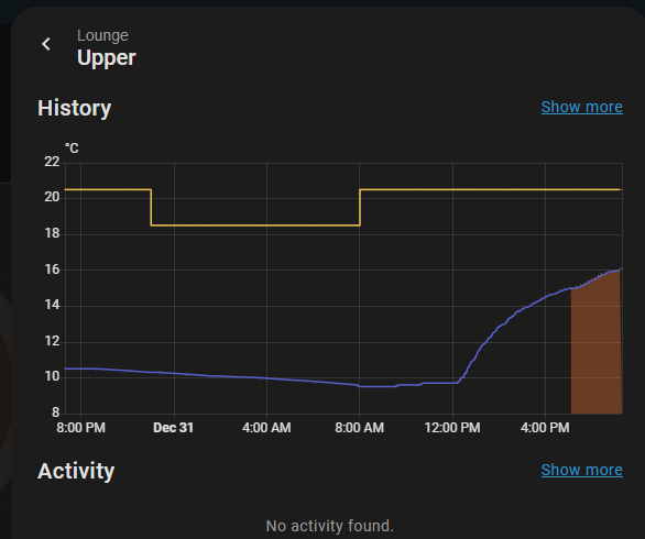 We have been away for a few days and just back so only been able to do a little investigation on the new updates. The system was set to holiday mode on the Ember App and set to come on at 12 today. I can see from the temp chart that heating kicked in and working towards the expected target temp of 20.5 on the upper zone. This is on Mode All Day.