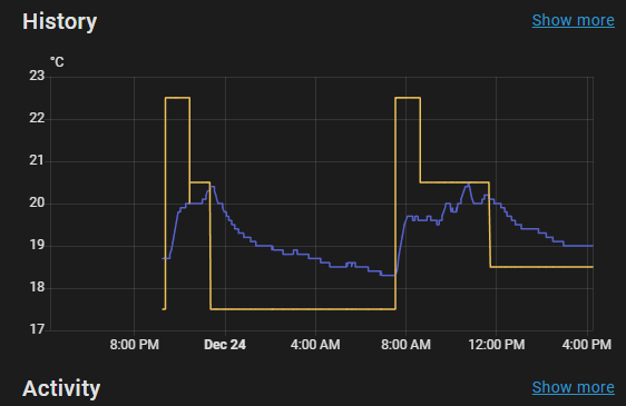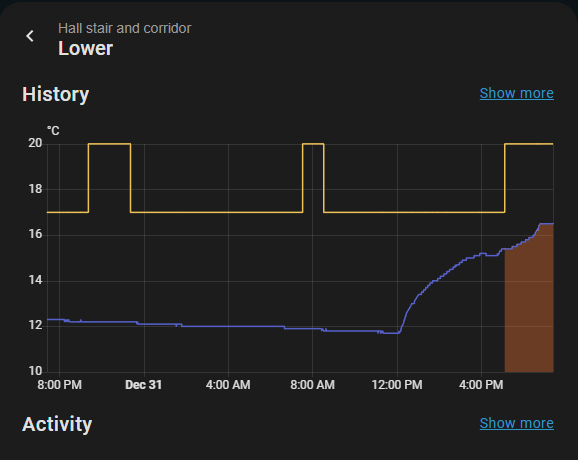 However the lower zone (Mode Auto), the target temperature as reported by the Ember App is 17 degrees. as it is on a setback (of 3 degrees), but in HA the control is reporting the target as 20 degrees. This jump seems to have occurred when I updated to version 3.5. I suspect the logic might for this controller has a bug.
