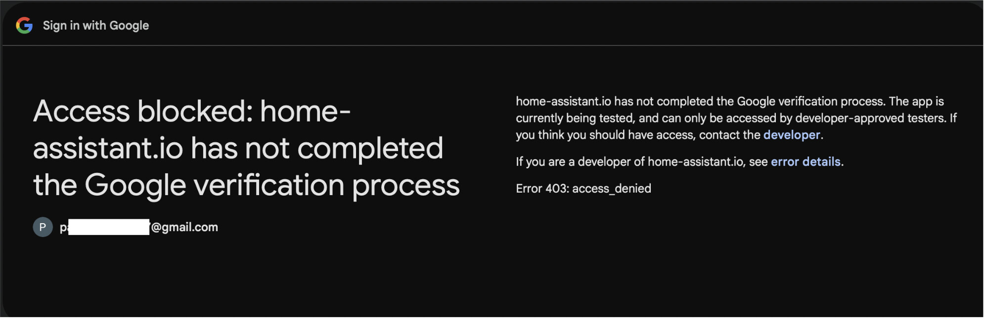 home-assistant.io has not completed the Google verification process. The app is currently being tested, and can only be accessed by developer-approved testers. If you think you should have access, contact the developer.